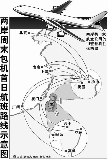 8——在兩岸周末包機(jī)中,臺(tái)灣方面同意開放桃園、高雄小港、臺(tái)中清泉崗、臺(tái)北松山、澎湖馬公、花蓮、金門、臺(tái)東等8?jìng)(gè)航點(diǎn)。