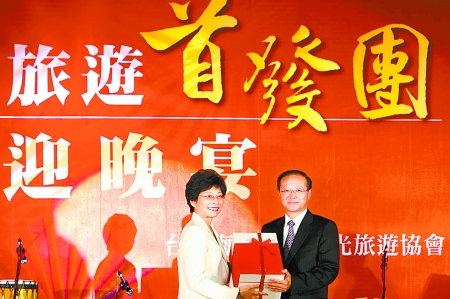 7月4日,在臺北圓山大飯店,臺灣海峽兩岸觀光旅游協(xié)會會長賴瑟珍(左)與大陸居民赴臺旅游首發(fā)團團長邵琪偉互贈禮品。