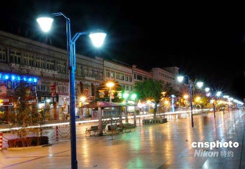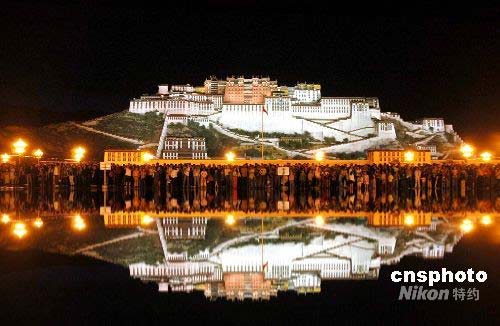 暑期的拉薩夜晚,高大宏偉的布達拉宮古建筑,在十幾盞巨大燈光的照耀下更顯壯觀而神奇。新改建的布達拉宮廣場,樂聲陣陣,噴泉迭起,各色燈光巧妙地把草坪、綠樹、垂柳裝點得似人間仙境,讓游客和市民們游樂其中,流連忘返。中新社發(fā) 周波 攝
