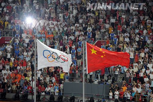 奧林匹克會(huì)旗(左)和五星紅旗在空中飄揚(yáng)。