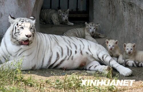 在濟南野生動物世界,4只虎崽依偎在白虎媽媽“榮榮”身邊。 (呂傳泉 攝)