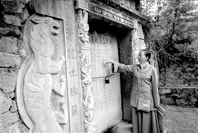 8日下午1時,記者一行來到彩色沙林,在導(dǎo)游羅女士的帶領(lǐng)下,駕車沿狹窄的山路艱難行進,在景區(qū)后山約5公里的山坡上找到了該墓。四周林蔭蒼翠,鴉雀無聲,左邊的主碑被一把鐵鎖牢封,呈豎立狀。右側(cè)是一塊橫著的碑,碑文主題為“鬼主之葬禮”。