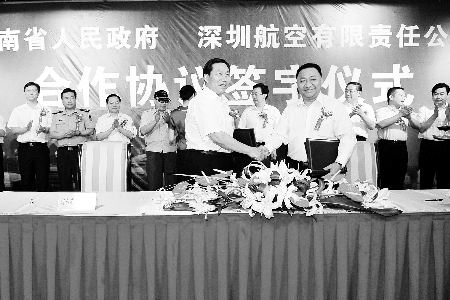 昨日,河南省副省長史濟春、深圳航空有限責任公司總裁李昆大筆一揮,合作協(xié)議簽署告罄。