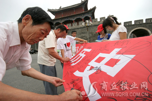 為了提高游客的文物保護意識,呼吁文明旅游,6名大學生利用暑假的時間,制作宣傳單和宣傳條幅在商丘市的一些旅游景點進行義務宣傳。昨天,6名大學生來到商丘古城景區(qū),展開宣傳條幅讓人們簽上自己的名字。