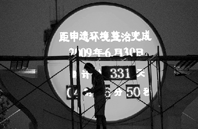 8月2日晚9時(shí),鄭州綠城廣場(chǎng)中心舞臺(tái)的西北角,施工人員正在腳手架上對(duì)“申遺環(huán)境整治倒計(jì)時(shí)牌”做最后的調(diào)試。
