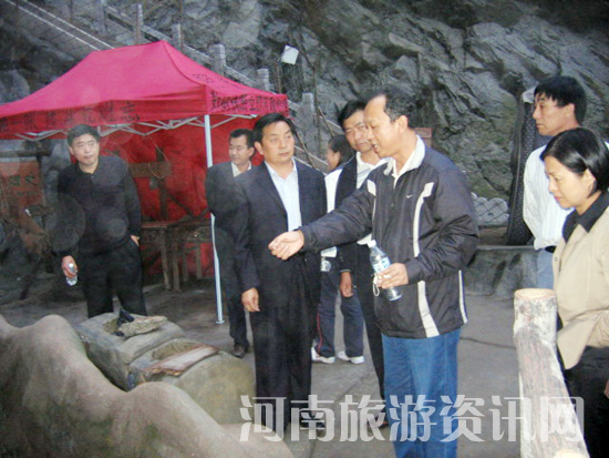 督查組副組長、省旅游局行業(yè)管理處處長張毅兵(右三)對(duì)景區(qū)深潭處的警示標(biāo)示和防護(hù)、救援措施提出整改意見