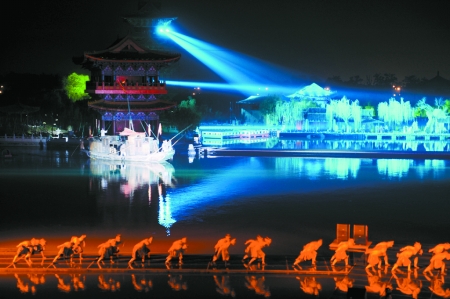 白天,游客爭(zhēng)先恐后地觀看各類精彩的民俗表演,盤鼓、高蹺、馬球、蹴鞠、水傀儡、皮影戲等眾多非物質(zhì)文化表演讓游客大開(kāi)眼界;場(chǎng)面宏大,炮聲震天響的宋金水上大戰(zhàn),讓游客嘆為觀止。夜晚,華燈初上時(shí)景區(qū)投資1.35億元傾力打造的大型水上實(shí)景演出《大宋·東京夢(mèng)華》讓游客在亦真亦幻之中,穿梭千年,感受夢(mèng)幻一樣的北宋東京。