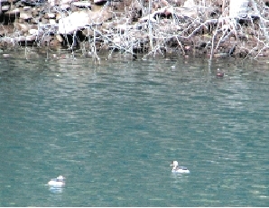 昨日上午,記者在鞏義浮戲山上馬臺水庫附近采訪時(shí),有村民說上馬臺水庫下游的一片水域內(nèi)有10多只鴛鴦,這些鴛鴦已經(jīng)出現(xiàn)好幾天了。按照村民的指引,記者來到發(fā)現(xiàn)鴛鴦的水域。這里是上馬臺水庫下游,水面不大,但清澈見底。水面上有4只顏色絢麗的水鳥在嬉戲,它們成雙入對的一會兒浮出水面,一會兒潛入水底,一直在遠(yuǎn)離山道的水域那邊活動,遠(yuǎn)遠(yuǎn)地躲開人們,山路上往來的汽車、摩托車聲音對它們沒有產(chǎn)生什么反應(yīng)。岸邊有一些游客和村民在駐足觀看,連聲稱奇。