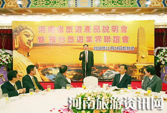11月24日,河南旅游產(chǎn)品說明會暨豫臺旅游業(yè)界聯(lián)誼會在臺北圓山飯店舉行。河南省政協(xié)主席王全書、中華兩岸旅行協(xié)會理事長許晉睿、河南省旅游局局長蘇福功、臺灣品質(zhì)保障協(xié)會理事長林進榮、臺灣觀光領(lǐng)隊協(xié)會理事長蕭志洋、臺灣旅游業(yè)經(jīng)理人協(xié)會副理事長白中仁、臺灣旅館經(jīng)理人協(xié)會理事長蘇乾亮,當(dāng)?shù)芈糜螛I(yè)界知名人士、近百家旅行社總經(jīng)理以及中國時報、聯(lián)合報、旅游界周刊等10多家臺灣主流媒體的新聞記者共280余人參加了說明會。