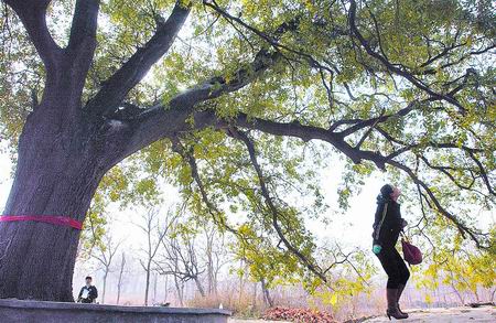 鄭州市文物考古研究院第三次全國文物普查隊在鄭州北郊普查時,在緊挨黃河大堤旁的金水區(qū)姚橋鄉(xiāng)來潼寨村發(fā)現(xiàn)了一棵千年皂角樹,樹高約30米,樹圍3.85米,需三人合抱方能抱住,枝繁葉茂的樹冠向外伸展,罩地一二畝,雖然已至冬季,四周樹木早已落葉,可這棵樹卻葉子青翠,枝杈縱橫,樹上的小鳥不停鳴叫(如圖)。據(jù)村民講,這棵皂角樹就是當年南宋皇帝趙構南渡時的拴馬樁。