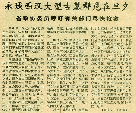 但是,芒碭山山體是石灰?guī)r,是生產(chǎn)水泥的主要材料,且質(zhì)量上乘,當?shù)厝罕娋涂可匠陨,多年來把炸山采石作為發(fā)家致富的主要手段。上個世紀80年代當?shù)刈盍餍械目谔柺?ldquo;炮聲一響,黃金萬兩”、“要想發(fā),山里挖”,開山采石者一度上萬人。一座座山幾乎是轉(zhuǎn)瞬之間就地消失或千瘡百孔,生態(tài)環(huán)境和文物古跡慘遭破壞。炸傷砸死事故不斷發(fā)生,群眾生命受到嚴重威脅。1990年11月22日《河南日報》以《永城西漢大型古墓群危在旦夕》為題予以報道,疾呼保護之聲振聾發(fā)聵。后來,國家文物局還專門下發(fā)《關(guān)于永城芒碭山文物保護工作的意見》。