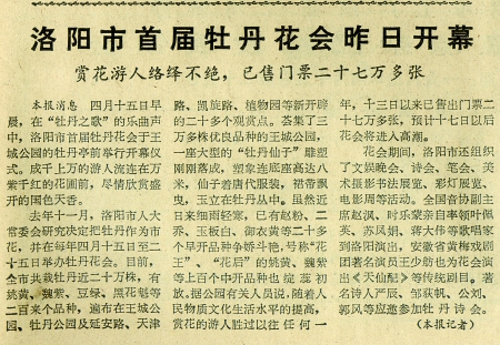 1983年4月15日,第一屆洛陽(yáng)牡丹花會(huì)橫空出世并獲得了意想不到的成功,到開(kāi)幕式前花會(huì)門(mén)票就賣(mài)出了20多萬(wàn)張。當(dāng)年《河南日?qǐng)?bào)》“洛陽(yáng)市首屆牡丹花會(huì)開(kāi)幕”消息詳細(xì)記述了開(kāi)幕式的盛況。時(shí)任王城公園主任、今年已76歲高齡的韓石頭老人回憶起第一屆牡丹花會(huì)情景時(shí)激動(dòng)不已。他說(shuō),那幾天洛陽(yáng)城內(nèi)人山人海,大小酒店爆滿(mǎn),口音不同、服飾各異的賞花客摩肩接踵。開(kāi)幕式那天,人們潮水般涌向王城公園,公園門(mén)口游客當(dāng)天被擠掉的鞋子就撿了3大筐……