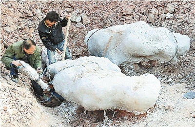 河南省汝陽(yáng)縣恐龍化石發(fā)掘近日又有重大進(jìn)展,在汝陽(yáng)縣劉店鄉(xiāng)發(fā)現(xiàn)了成片密集化石區(qū),出土的恐龍化石形體巨大,粗壯異常,其中最大的一塊長(zhǎng)3.3米、寬2.3米。經(jīng)專家認(rèn)定,這塊巨型恐龍化石比2007年7月命名的亞洲最大恐龍化石“汝陽(yáng)黃河巨龍”大很多,究竟屬于什么恐龍屬種還需進(jìn)一步研究確定。 新華社發(fā)