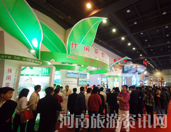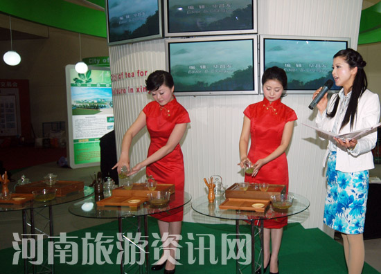信陽市在鄭州國際會展中心一樓主展區(qū)精裝搭建了150平方米的展臺,整個展臺的造型新穎別致,以茶為主題、以茶綠為主色調(diào),以俊山秀水、生態(tài)園林為主景,以茶文化、紅歷史、尋根游等為襯托,在琳瑯滿目的眾多展臺中別具一格,大放異彩。優(yōu)美的信陽旅游風光片,動人的古編鐘演奏,雅致的茶藝表演,體型碩大的南灣鰱魚,為整個展臺增添了亮點。