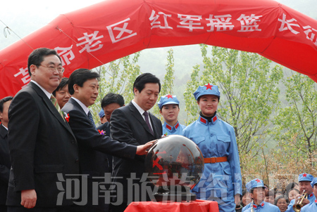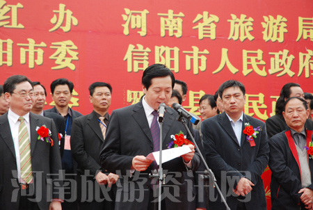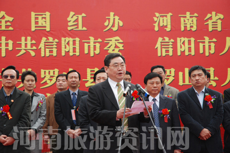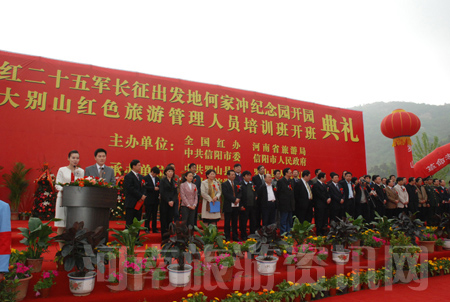 河南省旅游局局長蘇福功在致辭中說,伴隨著河南旅游的快速發(fā)展,我省紅色旅游也取得了長足進(jìn)步。多年以來,我們依托豐富的紅色旅游資源,統(tǒng)一規(guī)劃,重點(diǎn)發(fā)展,已收到良好成效。特別是信陽市委、市政府對發(fā)展紅色旅游高度重視,目前信陽的紅色旅游已成為全省乃至全國紅色旅游發(fā)展的新亮點(diǎn)。今天“紅二十五軍長征出發(fā)地——何家沖開園暨鄂豫皖大別山紅色旅游管理人員培訓(xùn)班開班典禮”活動(dòng),是促進(jìn)我省紅色旅游又好又快發(fā)展的一項(xiàng)重要舉措,對于弘揚(yáng)以愛國主義為核心的偉大民族精神,進(jìn)一步提升紅色旅游品牌的輻涉力,構(gòu)建社會(huì)主義和諧社會(huì)具有十分重要的意義。