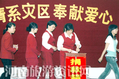 5月12日14:28四川省汶川縣發(fā)生了7.8級(jí)的地震,受到全社會(huì)的關(guān)注。鄭州黃河風(fēng)景名勝區(qū)的職工們情系災(zāi)區(qū),紛紛解囊,為抗災(zāi)救災(zāi)捐款。5月15日上午九點(diǎn)半開(kāi)始捐款,景區(qū)的商戶也聽(tīng)聞前來(lái)捐款,不到半個(gè)小時(shí),現(xiàn)場(chǎng)共捐款33200元。截至中午12點(diǎn),共捐款53860元。這些錢(qián)載著景區(qū)全體職工對(duì)災(zāi)區(qū)人民的祝福、祈禱和情誼,希望他們能早日擺脫苦難,重建家園。