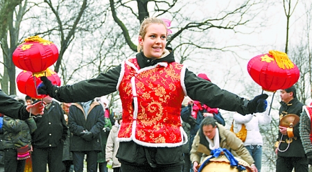 1月24日,在瑞典首都斯德哥爾摩,一名瑞典姑娘跳起歡快的中國燈籠舞,慶祝中國農(nóng)歷牛年的到來。(新華社)