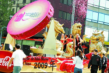 1月24日,“2009年春節(jié)花車大游行”在墨西哥城進行。圖為載著龍獅的花車在墨西哥城改革大道上游行!。ㄐ氯A社)