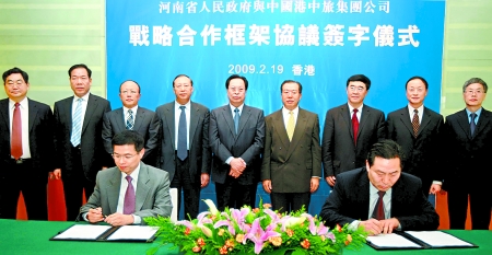 2月19日上午,我省與中國(guó)港中旅集團(tuán)公司簽署戰(zhàn)略合作協(xié)議,共同開(kāi)發(fā)河南豐富的旅游資源,共謀發(fā)展,共建雙贏。省委書(shū)記、省人大常委會(huì)主任徐光春,省委常委、省委秘書(shū)長(zhǎng)曹維新,副省長(zhǎng)史濟(jì)春,港中旅集團(tuán)公司董事長(zhǎng)張學(xué)武等出席簽字儀式。