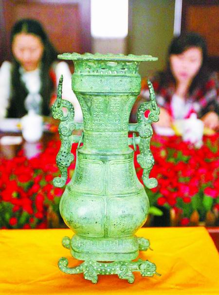 昨天展示的龍耳虎足方壺高約35厘米,寬47厘米,重約8斤,是原文物的三分之二大小,成本價(jià)1萬多元。