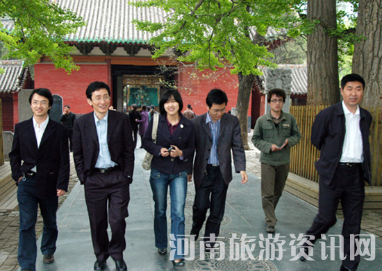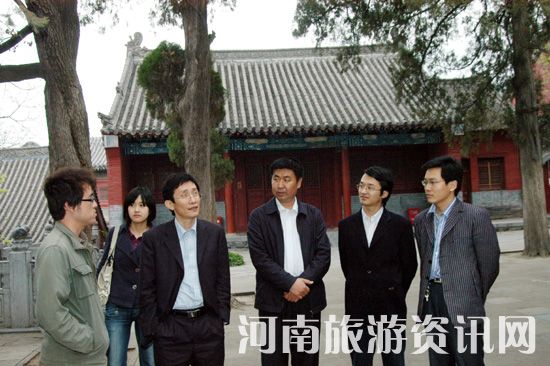 倪鵬飛(左二)一行在少林寺景區(qū)內(nèi)考察,省旅游局副局長宋爭輝(右一)陪同考察。