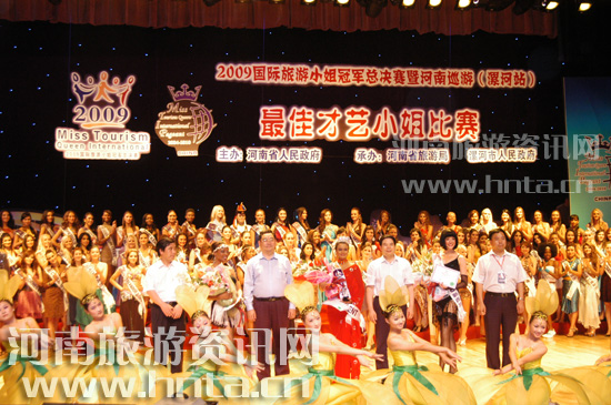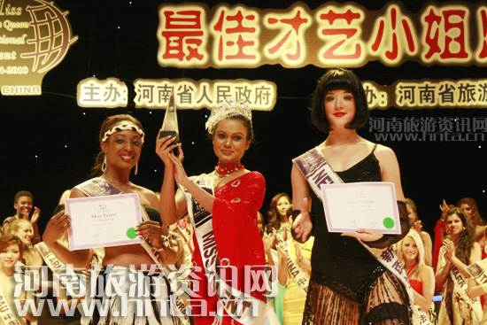 18日晚,佳麗們盡情展示自己的多才多藝,角逐最具才藝小姐單項賽冠軍。選手們吹拉彈唱,各顯其能,進行了充滿風情的、極具民族風格的特色表演。印度舞、蒙古舞、肚皮舞……令人目不暇接;奧地利佳麗唱起了電影《音樂之聲》中的經典曲目,中泰混血兒——普吉島佳麗敲起了中國鼓,黑山佳麗則端莊地唱起了國歌……三個小時的比賽過程更像是一場精彩紛呈的國際性文藝演出。最終,斯里蘭卡、新西蘭、津巴布韋小姐分別獲得單項賽冠、亞、季軍。河南省旅游局局長蘇福功,省旅游局副局長、活動副指揮長倪豫州分別為冠軍、亞軍得主頒發(fā)證書,并與獲獎佳麗合影留念。