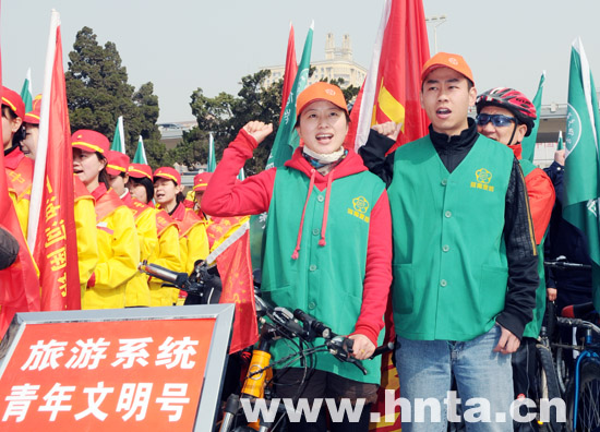 啟動(dòng)儀式結(jié)束后,交通、旅游、郵政等行業(yè)的五支“低碳生活、綠色出行”青年文明號(hào)騎行隊(duì)沿著花園路、紫荊山路、人民路、金水東路進(jìn)行騎行宣傳,積極倡導(dǎo)綠色低碳理念,提高人們的環(huán)保意識(shí),共同培養(yǎng)生態(tài)文明的工作方式。