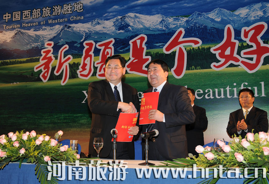 會(huì)上,河南省旅游局局長(zhǎng)蘇福功和新疆自治區(qū)旅游局局長(zhǎng)伊那木•乃斯?fàn)柖》謩e代表豫新兩省旅游局簽訂旅游合作發(fā)展框架協(xié)議,兩省旅行社代表也相互簽訂了旅游客源協(xié)議,與會(huì)領(lǐng)導(dǎo)共同啟動(dòng)了“萬(wàn)人游新疆•萬(wàn)人游河南”活動(dòng)。