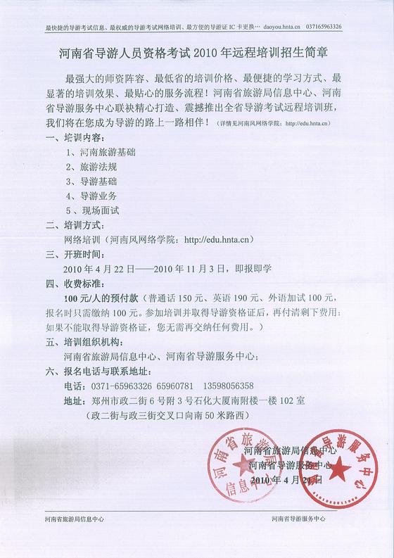 4月22日, 河南省導(dǎo)游人員資格考試2010年遠(yuǎn)程培訓(xùn)開班。