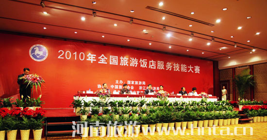 由國家旅游局主辦、浙江省旅游局和寧波市人民政府承辦的“2010年全國旅游飯店服務(wù)技能大賽”,于7月14日至15日在寧波落幕。來自全國31個省市自治區(qū)和新疆建設(shè)兵團(tuán)的32個代表隊128名選手參加比賽。國家旅游局副局長杜江,浙江省旅游局副局長葉建國以及寧波市副市長徐明夫、副秘書長黃輝等領(lǐng)導(dǎo)出席開幕式。