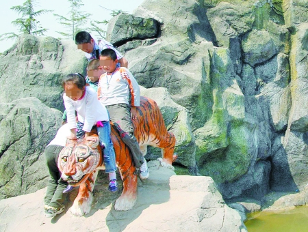在吉林園內(nèi)的長白山下,有一個(gè)老虎下山雕像,不少家長把小孩抱到老虎身上合影留念(如圖),最多時(shí)一只老虎身上騎了4個(gè)小孩。在青海省展園,設(shè)置有三只白色綿羊雕像,其中最大個(gè)的綿羊最受傷,其右耳不知何時(shí)竟被游客折斷了。