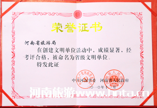 近年來,省旅游局精神文明建設工作圍繞省委工作重點,認真貫徹執(zhí)行《河南省文明單位建設管理條例》,以加強黨的執(zhí)政能力建設和先進性建設為主線,以各種學習教育活動為載體,堅持“服從中心、服務大局,干在實處、走在前列”,充分發(fā)揮黨組織的戰(zhàn)斗堡壘作用和共產(chǎn)黨員的先鋒模范作用,推動了我省旅游產(chǎn)業(yè)不斷發(fā)展。在2010年省級文明單位創(chuàng)建工作中,經(jīng)過全局干部職工的共同努力,省旅游局在全省各行業(yè)中脫穎而出,再次榮獲“省級文明單位”的光榮稱號。