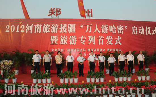 6月15日,2012河南旅游援疆“萬(wàn)人游哈密”活動(dòng)啟動(dòng)儀式暨旅游專(zhuān)列首發(fā)式在鄭州火車(chē)站舉行。省人大副主任儲(chǔ)亞平、省政協(xié)副主席李英杰等領(lǐng)導(dǎo)出席,省委組織部、省發(fā)改委、省援疆辦、省旅游局、鄭州鐵路局領(lǐng)導(dǎo)以及各市旅游業(yè)界代表、廣大游客參加。省旅游局局長(zhǎng)范修芳,省發(fā)改委副主任、省援疆辦副主任靳磊,鄭州鐵路局副局長(zhǎng)楊偉軍分別致辭。省人大副主任儲(chǔ)亞平宣布2012河南萬(wàn)人游哈密活動(dòng)啟動(dòng)。旅游援疆是我省對(duì)口援疆工作的重要內(nèi)容,2012河南“萬(wàn)人游哈密”是旅游援疆的具體舉措。以“援疆號(hào)”旅游專(zhuān)列開(kāi)行為標(biāo)志正式拉開(kāi)我省旅游援疆“萬(wàn)人游哈密”活動(dòng)的序幕。