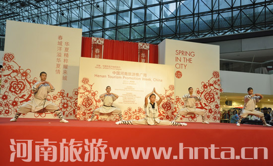 中國(guó)駐新加坡大使館文化參贊肖江華先生在開(kāi)幕式上說(shuō),從河南省的主要旅游景點(diǎn)的圖片展示中,他對(duì)河南有了更深的印象,中原大地的壯麗山河和文化遺產(chǎn)讓他驚嘆不已。他希望河南省和新加坡增加交流,借鑒雙方的優(yōu)秀經(jīng)驗(yàn),共同促進(jìn)兩地的合作和發(fā)展,使旅游成為傳遞中新友誼的紐帶。林璒利女士也在開(kāi)幕式致辭。她首先感謝我省對(duì)“春城洋溢華夏情”旅游展的支持,對(duì)我省旅游推廣周活動(dòng)給予了高度的評(píng)價(jià),并表示今后將會(huì)一如既往地在新加坡推廣河南旅游,為雙方的合作共贏努力。新加坡最大的國(guó)際旅行社---曾兄弟?chē)?guó)際旅行社的負(fù)責(zé)人也做了發(fā)言。她說(shuō),正是由于河南省旅游局的重視,有了廈航直航的支持,他們?cè)谕茝V河南旅游方面的熱情更加高漲,并表示將會(huì)通過(guò)電視、報(bào)紙、網(wǎng)絡(luò)等渠道加大對(duì)河南的宣傳推廣力度,提高新加坡人民對(duì)河南的認(rèn)知度,組織更多客源到河南旅游觀(guān)光。接下來(lái),肖江華參贊同大家一起觀(guān)看了少林棍、童子功、雙節(jié)棍及舞蹈“青衣﹒青花”等精彩演出。演出引起全場(chǎng)的陣陣掌聲,吸引眾多新加坡市民和國(guó)外游客駐足觀(guān)看。