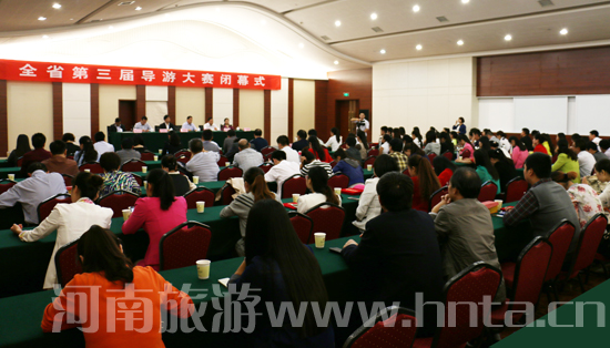 9月20日,全省第三屆導(dǎo)游大賽在鄭州落下帷幕。省旅游局李亞白副局長、省財(cái)貿(mào)輕紡煙草工會(huì)李國華主任等出席了閉幕式。李亞白副局長作了講話,李國華主任宣讀了《表彰決定》,大賽總裁判長芮衛(wèi)生對(duì)大賽進(jìn)行了點(diǎn)評(píng),與會(huì)領(lǐng)導(dǎo)共同為獲獎(jiǎng)選手和代表隊(duì)頒發(fā)了獎(jiǎng)杯和證書。