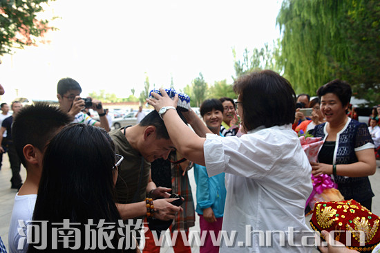 河南省旅游局副局長何琳為首發(fā)團游客帶上新疆特色帽子