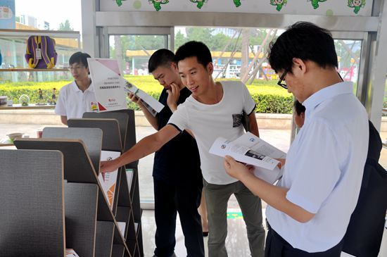游客在河南旅游咨詢服務(wù)臺(tái)展示架取閱宣傳資料