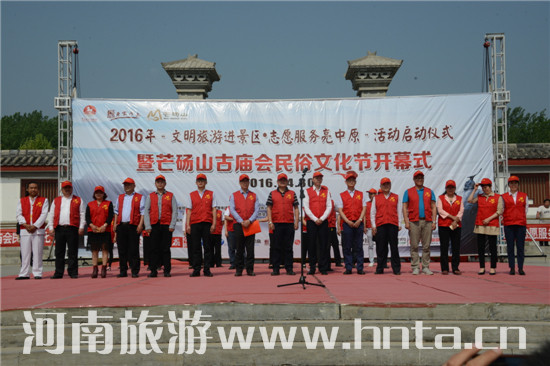 永城市政府副市長梁廷振向來賓與旅游志愿者致辭,永城市政府黨組成員、芒碭山景區(qū)管委會主任張福光宣讀《文明旅游和志愿服務倡議書》,省旅游局文明辦副調(diào)研員張宏偉向景區(qū)“文明旅游志愿服務隊”授旗、省旅游局局直團委書記高翔向芒碭山旅游區(qū)授予“河南省旅游志愿者服務基地”銅牌、省旅游局信息中心工會主席、河南省攝影家協(xié)會旅游分會常務副秘書長楊志威向景區(qū)授予“攝影創(chuàng)作基地”銅牌。省旅游局副巡視員潘進軍,永城市副市長梁廷振共同為獅子點睛啟動2016年河南省“文明旅游進景區(qū)•志愿服務亮中原”活動暨“芒碭山古廟會民俗文化節(jié)”開幕式。