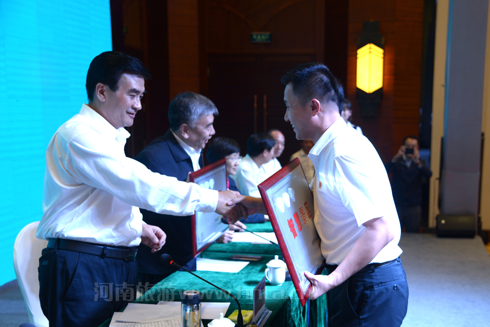 河南省政府副省長何金平、文化和旅游部信息中心副主任信宏業(yè)為“三鉆級智慧景區(qū)”頒發(fā)獎牌