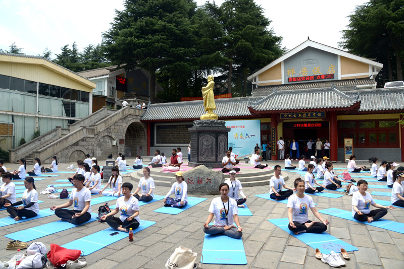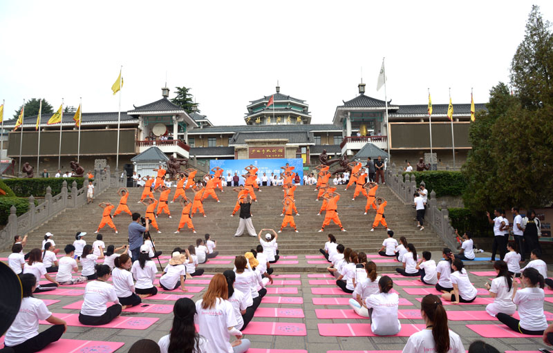 在少林景區(qū)少林寺武術(shù)館大門口,功夫與瑜伽水乳交融,伴隨著悠揚(yáng)的旋律,百名少林弟子禪坐靜思的同時(shí),荷馬仕瑜伽學(xué)院的荷馬仕老師帶領(lǐng)200名瑜伽愛好者共同展示優(yōu)美舒展的瑜伽動(dòng)作,讓大家感受身心合一的美妙境界。