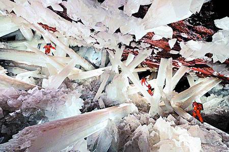 在你注意到照片中身穿橙色工作服的工人之前,你很難領(lǐng)會這片地下“水晶森林”是何等的壯觀。巨大且發(fā)光的方尖石塔多達170根,像纏繞在一起的光柱一般,散落在洞穴四周。其中最大的一根長 約11.4米。巖壁十分潮濕,上面覆蓋著一簇簇完美無瑕的晶體,就好似刀片一樣鋒利。地質(zhì)學(xué)家胡安·曼紐爾說:“礦石竟以如此美麗的姿態(tài)展示自己,這在地球上是獨一無二的。”