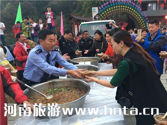 記者在現(xiàn)場(chǎng)看到,旅游警察們免費(fèi)發(fā)放的“暖身湯”是由土豬肉、木耳、香菇、豆腐、粉條等山里人的特色吃食熬制而成,湯稠肉多,所有的游客都可以免費(fèi)領(lǐng)食,免費(fèi)加食,吃飽為止。