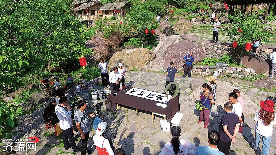 書法家在小溝背景區(qū)揮毫潑墨,向游客贈(zèng)送書法作品