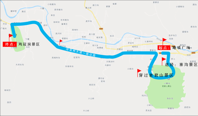 比賽路線:地質(zhì)廣場(chǎng)(起點(diǎn))—鸞州大道—寨溝—老君山景區(qū)—鸞州大道—雞冠洞景區(qū)(終點(diǎn))
