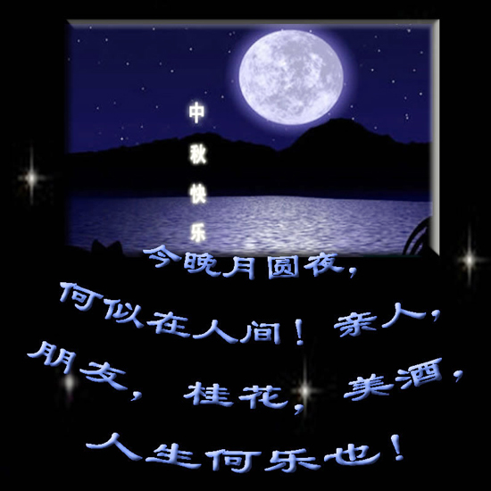 2011中秋節(jié)祝福語:15、月到中秋了,你我天各一方。歲月流失的都是美好,我會想你,你記得那句話嗎? 明月情依依,繁星語切切!