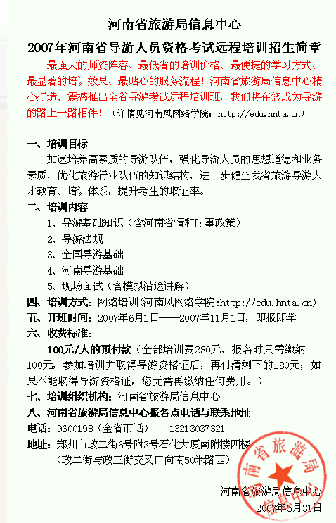 1、河南省旅游局培訓(xùn)中心將為我們指定全省最優(yōu)秀的教師隊(duì)伍,并統(tǒng)一劃定培訓(xùn)提綱和培訓(xùn)范圍,培訓(xùn)質(zhì)量有充分的保證,取證更添幾分把握;