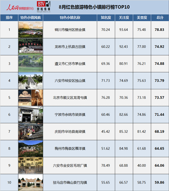 人民網(wǎng)輿情數(shù)據(jù)中心與北京電視臺(tái)京視傳媒聯(lián)合發(fā)布的“8月紅色旅游特色小鎮(zhèn)排行榜TOP10”,以住建部公布的403個(gè)“國家級(jí)特色小鎮(zhèn)”為篩選對(duì)象,從各個(gè)紅色旅游特色小鎮(zhèn)的名度、關(guān)注度及美譽(yù)度三個(gè)維度出發(fā),通過海量數(shù)據(jù)分析和數(shù)理模型計(jì)算,呈現(xiàn)紅色旅游特色小鎮(zhèn)的綜合影響力,為游客提供出行必要參考。