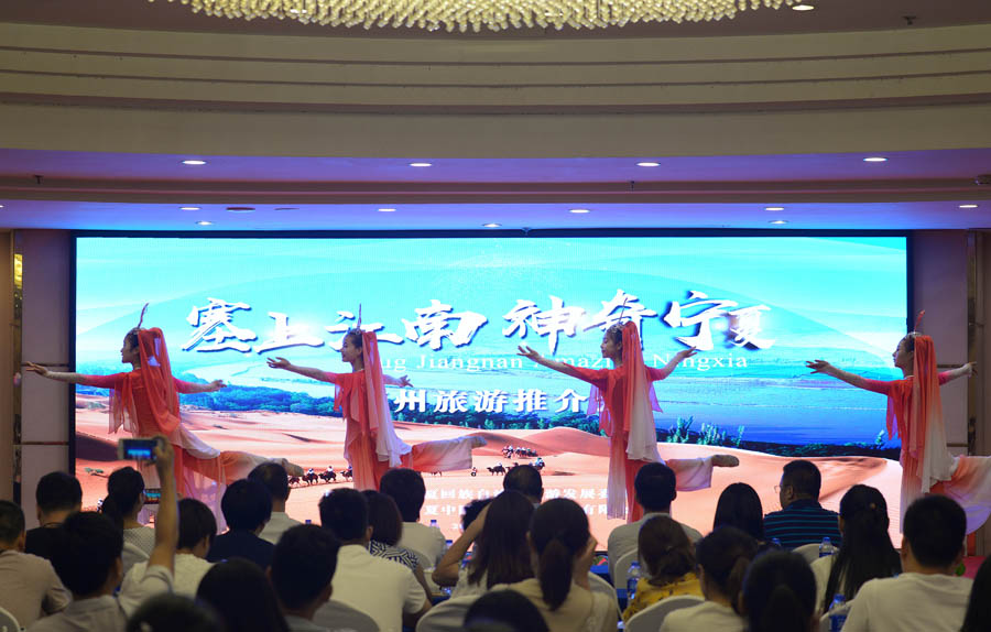 曲聲悠揚、舞姿曼妙,歌舞表演《相約寧夏》拉開了推介會的序幕,推介會上來自寧夏沙湖、沙坡頭、西夏陵、賀蘭山巖畫、西夏風情園、鎮(zhèn)北堡西部影城、鳴翠湖國家濕地公園、永寧文化園、銀川黃河軍事文化博覽園、水洞溝、青銅峽黃河樓、黃河大峽谷、須彌山、六盤山國家森林公園、閱海公園等景區(qū),寧夏中國國際旅行社等旅游企業(yè)代表進行了現(xiàn)場聯(lián)推,濃縮精華展示精彩,將景區(qū)特色展示給現(xiàn)場觀眾,并且通過現(xiàn)場播放寧夏旅游宣傳片并設(shè)置有獎問答,送出特色小禮物的形式讓到場觀眾深刻的記住了“塞上江南 神奇寧夏”是如此之景色秀美,物產(chǎn)豐饒。