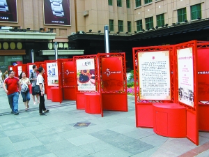 北京市“文化遺產日”活動現(xiàn)場,幾個路人從介紹文化遺產的展板前經過。