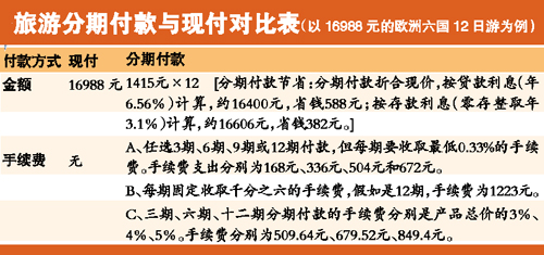 以16988元的歐洲六國12日游線路為例,選擇分12期付款的游客每個月只要付1415元,連續(xù)支付一年后才付出16988元,而按照零存整取年息3.1%計算,這筆錢只相當于一年前的16606元,游客為此就節(jié)省了382元。